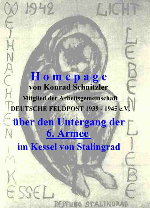 Mein Sammelgebiet ist die Feldpost aus bzw. in den K e s s e l v o n S t a l i n g r a d 22.11.1942 - 2.2.1943 einschließlich der “ Vorläufer “ ( Einheit bereits im Bereich Stalingrad - ab Mitte August 1942 ) bzw. “ Nachläufer “ z. Bsp. Briefe an den türkischen Halbmond , Nachforschung von Angehörigen etc. Auf den nachfolgenden Seiten sind viele Fakten und Daten aufgelistet, die im Laufe der Jahre zusammengetragen wurden und durch amtliche Dokumente bzw. durch Zeitzeugen und Literatur belegt sind. Siehe Übersicht ! Für Anregungen - Fehlermeldungen - Meldung von Besonderheiten - etc. bin ich sehr dankbar ! Weitere Daten werden ergänzt ! |